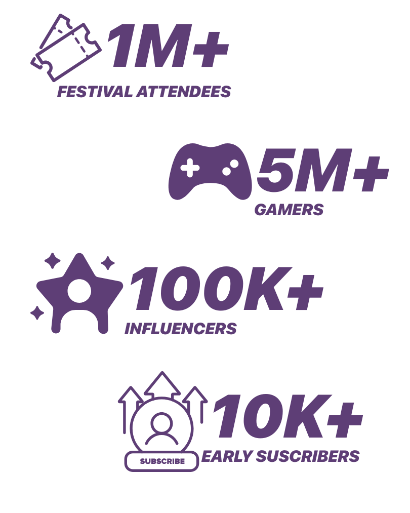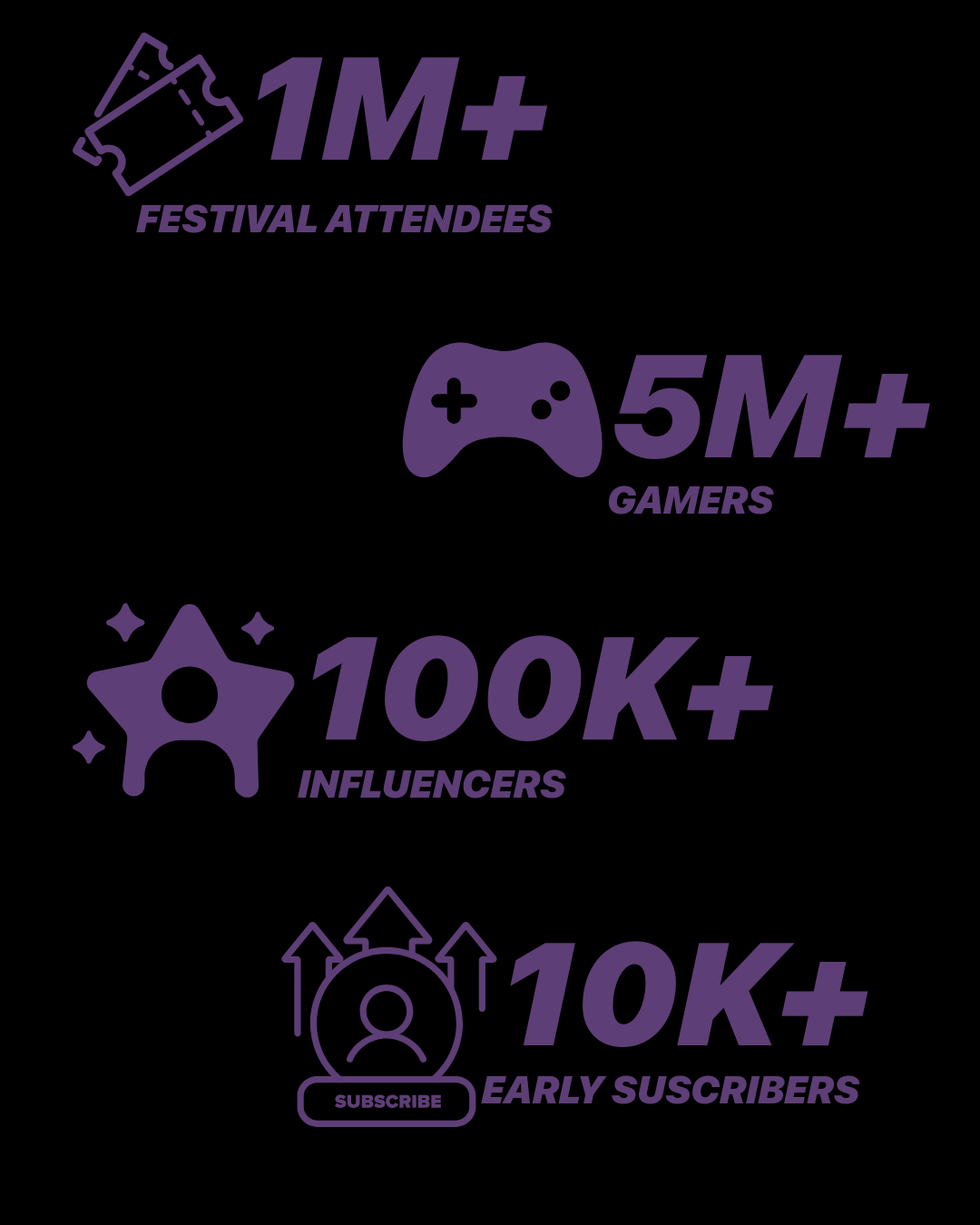 BossFightz merges gaming, live music, and lifestyle into one platform — spanning global festivals, app engagement, and exclusive Gamewear collabs. Our partners connect directly with a fast-growing audience of gamers, creators, and fans worldwide.